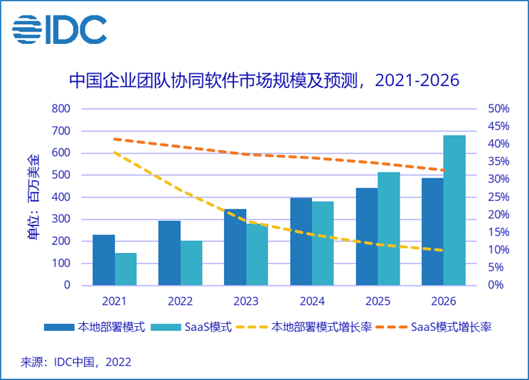 IDC猜测,在未来五年,企业团队协同SaaS商场的增速要远高于本地布置形式,企业团队协同SaaS软件的未来5年复合增加率估计为36.0%。估计在2025年,企业团队协同SaaS的商场份额将超越本地布置形式商场。