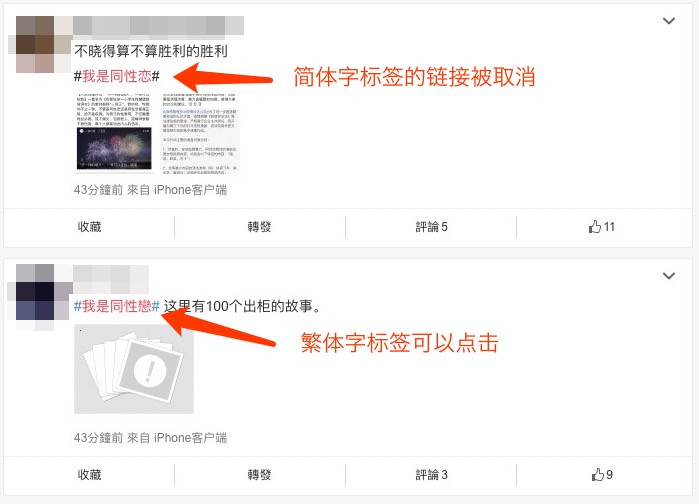 到发稿,微博上以简体字显现的“#我是同性恋#”标签仍然无法点击,“#你好,我是同性恋#”、“#我是同性恋者#”标签未受影响。