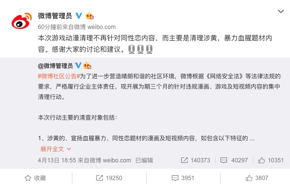 。名为“微博管理员”的微博帐号以转发 4 月 13 日公告微博的方法表明“本次游戏动漫整理不再针对同性恋内容,而主要是整理涉黄,暴力血腥体裁内容。感谢我们的评论和主张。”除此之外没有进行更多阐明。