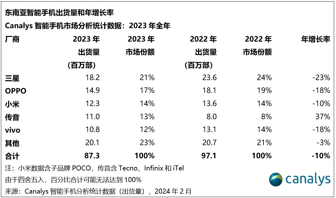 Canalys:2023 Q4 东南亚手机市场迎来复苏,成功扭转连续七个季度下跌趋势