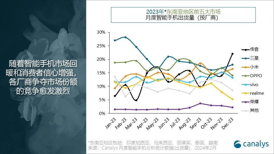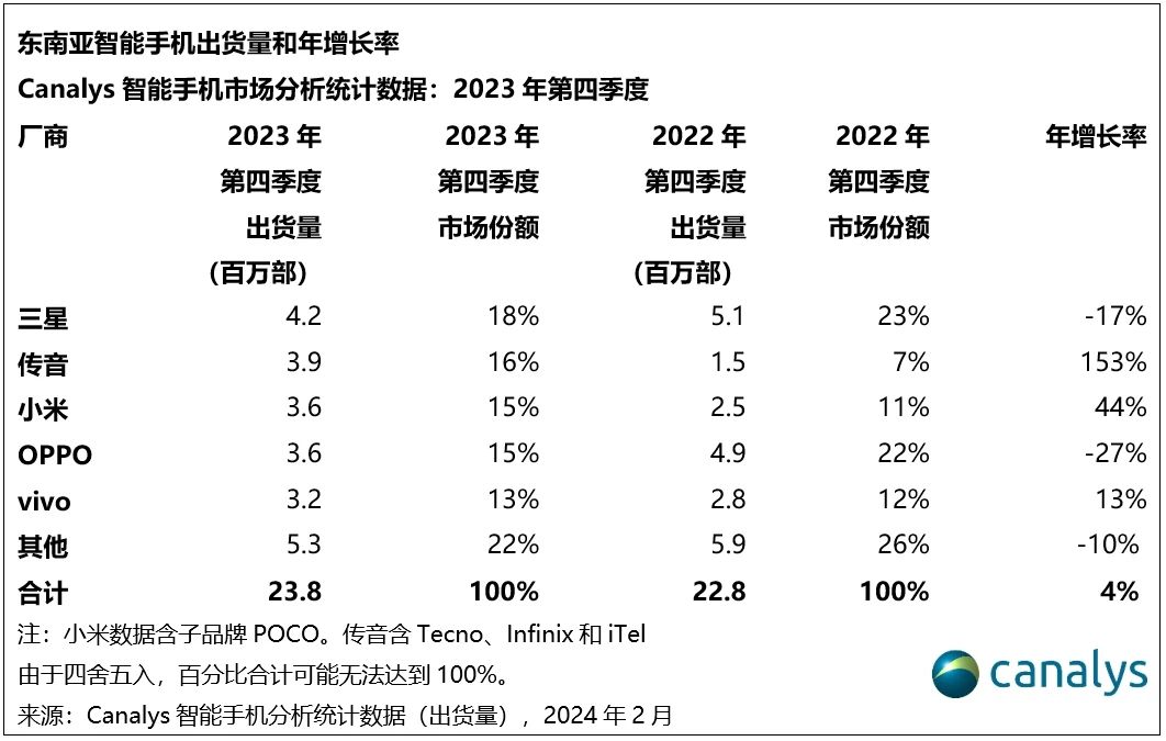 依据Canalys发布的陈述,2023年第四季度,东南亚区域智能手机商场同比添加4%,到达了2380万部。受宏观经济不利因素和通货膨胀的影响,该区域在2023年年头体现疲软,导致顾客开销大幅下降。但商场随后呈现反弹,在品牌活跃发布新品和途径鼓舞办法推进下,顾客对智能手机的需求有所康复。