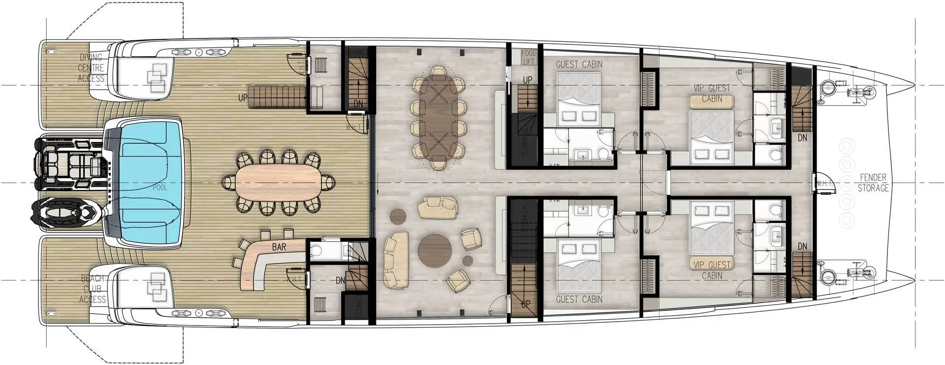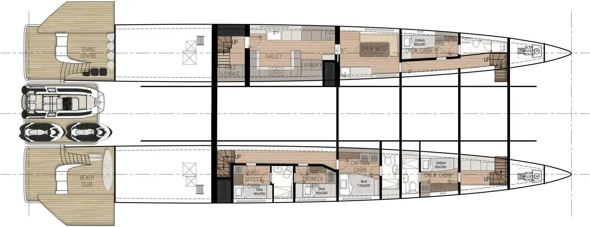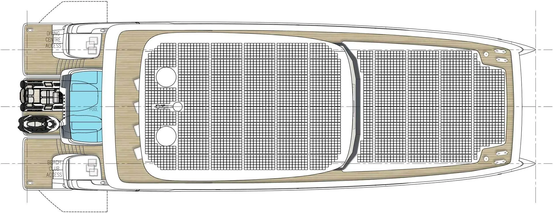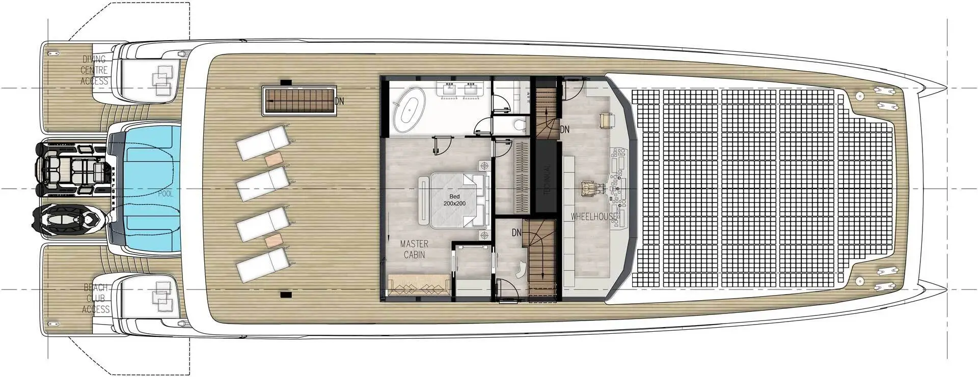 在内部,您会被 535 平方米的宽广生活空间所震慑,这些生活空间能够定制,包含水疗中心、图书馆或健身房。它还具有可包容十间客房和七名船员的空间。宽阔的主套房设有室外甲板区,而其下方的楼层则设有室外游泳池、酒吧和用餐区。